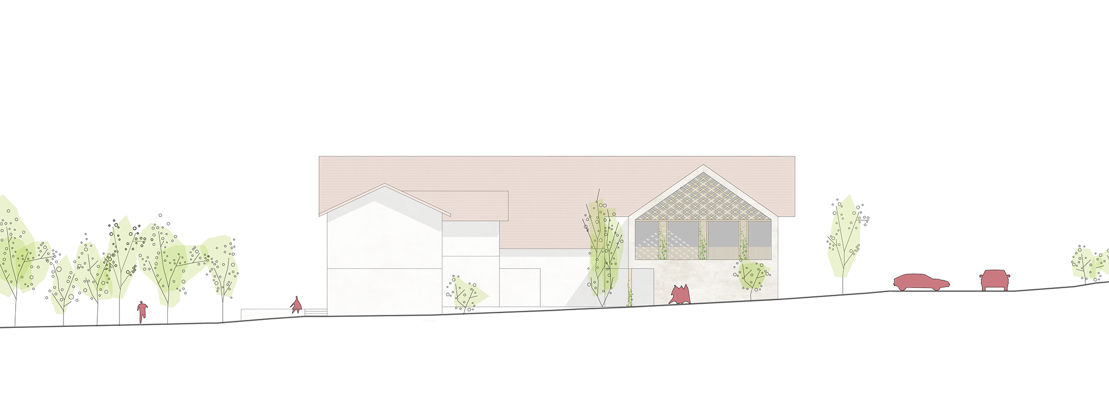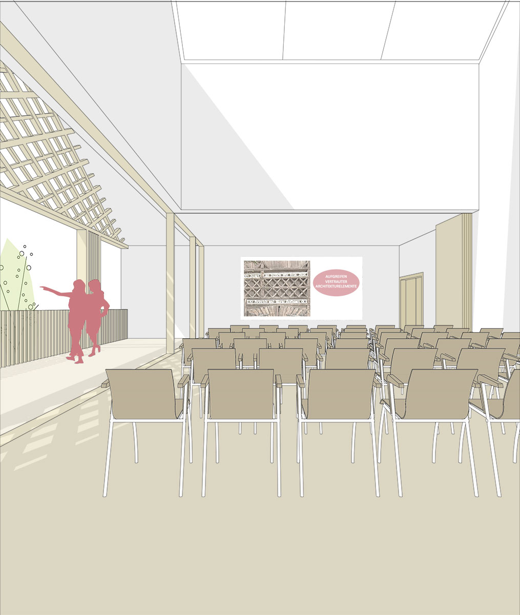 Die vorgeschlagene Arkade weitet den Hof zusätzlich räumlich auf, sie wird zum Vordach mit natürlicher Beschattung und verweist auf den Eingang ins Gemeindeamt. An der Giebelwand des Hauses liegt als weithin sichtbares Zeichen eine Loggia vor dem Saal, die zum Luft Schnappen einlädt und von erhabener Position Blicke in die Umgebung inszeniert.