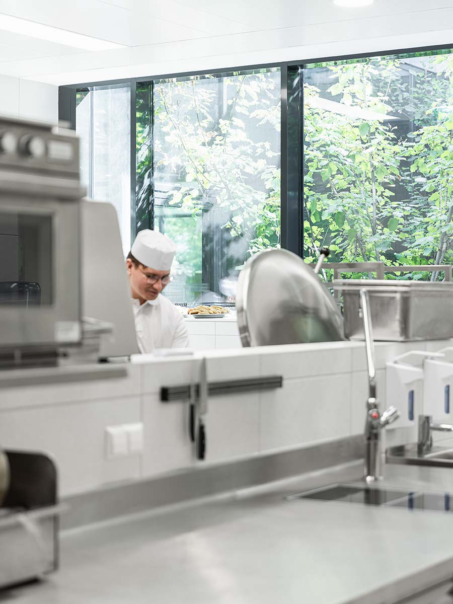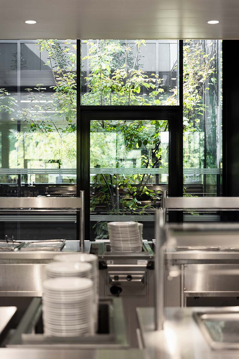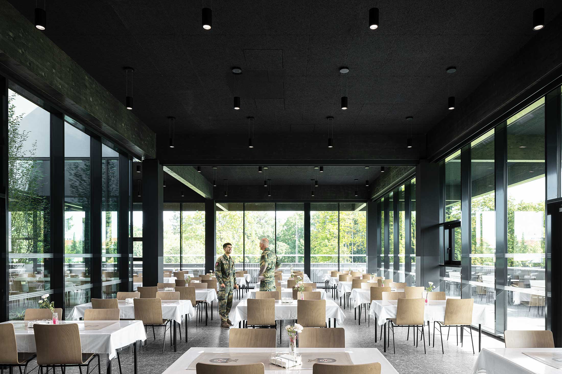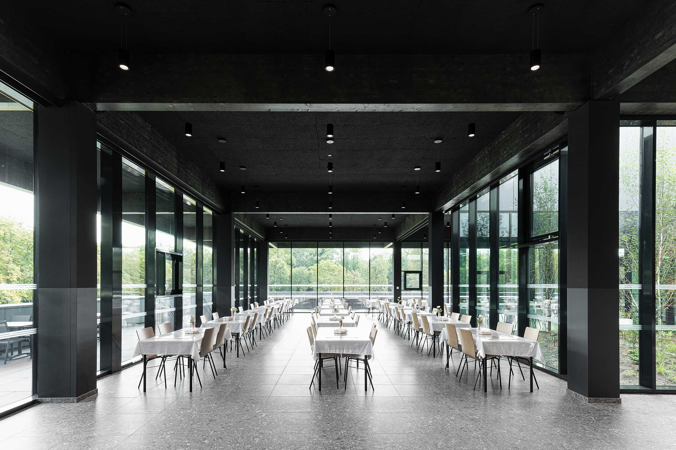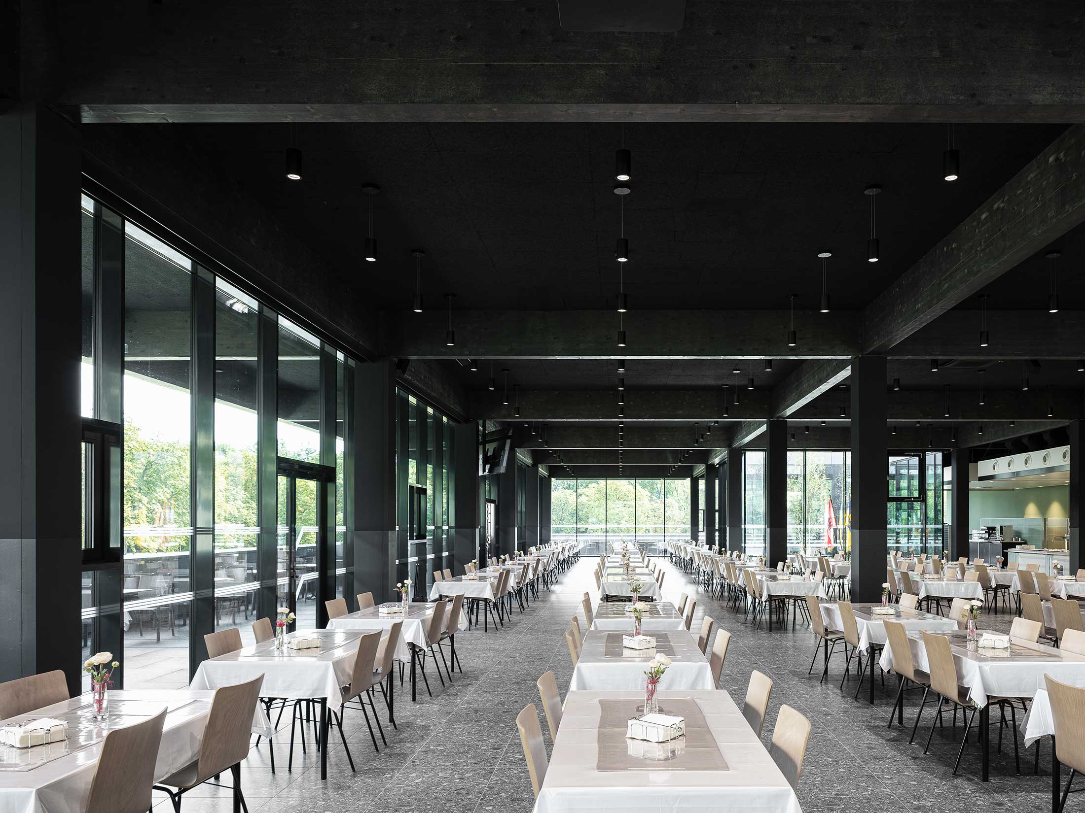 Die Anmutung des Gebäudes leitet sich von warmen dunklen Felsen ab. Die Deckenplatten sind schwarz lasiert, das erzeugt eine einheitliche Atmosphäre der Geborgenheit trotz unterschiedlicher Materialien, die für den jeweiligen Zweck optimiert sind: Stützen und untere Deckenplatte aus Stahlbeton, das Dachtragwerk als Holzleimbinderkonstruktion, die Fassadentafeln aus Faserbeton und die Böden aus schwarzem Terrazzo. Einzelne Elemente wie die Möbel und die Raumnische der Speiseausgabe bringen mit Eichenholzoberflächen eine angenehme Haptik mit sich, sie greifen sich gut an.
