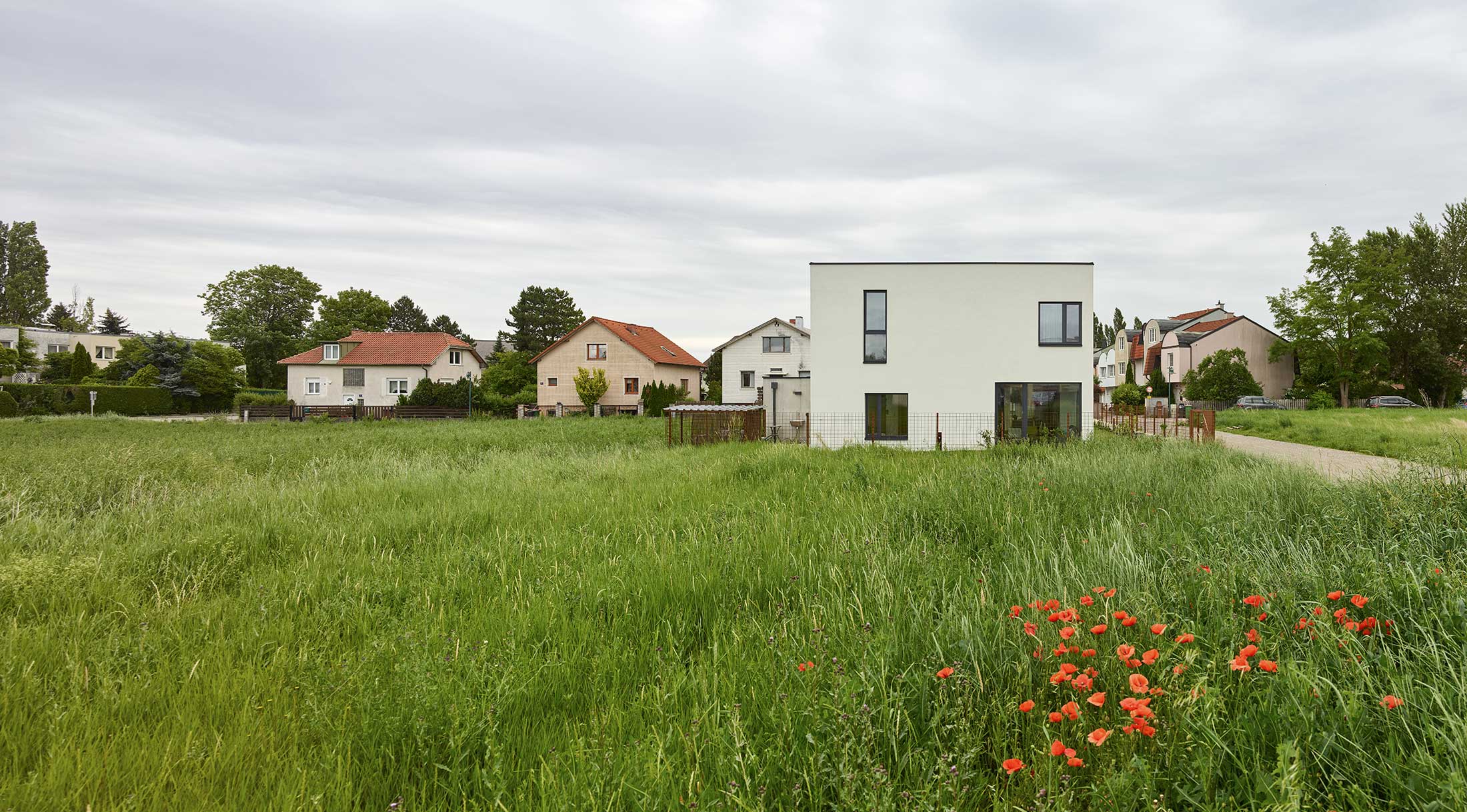 Zwei Häuser bilden eine Skulptur. Ein zweigeschossiges für die Eltern und das eingeschossige für die erwachsenen Söhne, das später einmal auch einfach anders genutzt werden kann. Dazwischen liegen der Eingangsbereich und eine gemeinsame Loggia. Nebengebäude bilden eine schmale Gasse, die zum Haupteingang führt. Dort angelangt weitet sich dieser Weg zu einem kleinen Hof. Die Atmosphäre erinnert an das Haus im Straßendorf, in dem der Bauherr aufgewachsen ist.